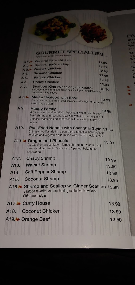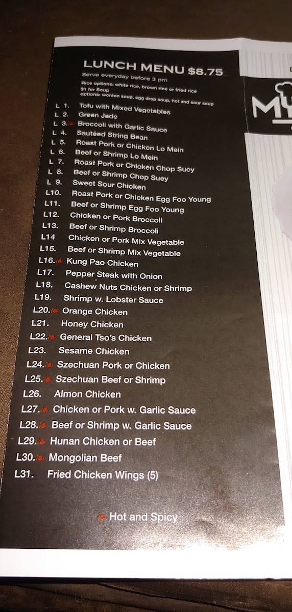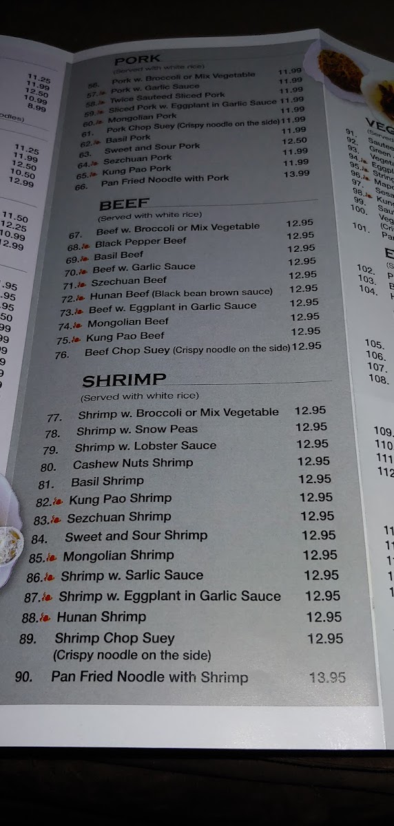 - Vegetable Dishes: Includes Sautéed Mix Vegetables, Eggplant in Garlic Sauce, Ma Po Tofu, Sesame Tofu, and other vegetable-focused options, catering to vegetarian preferences.