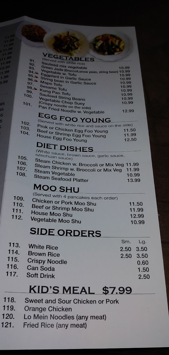 - Egg Foo Yong: Includes choices such as Pork, Chicken, Beef, Shrimp, and a House special, each served as a main entrée.
